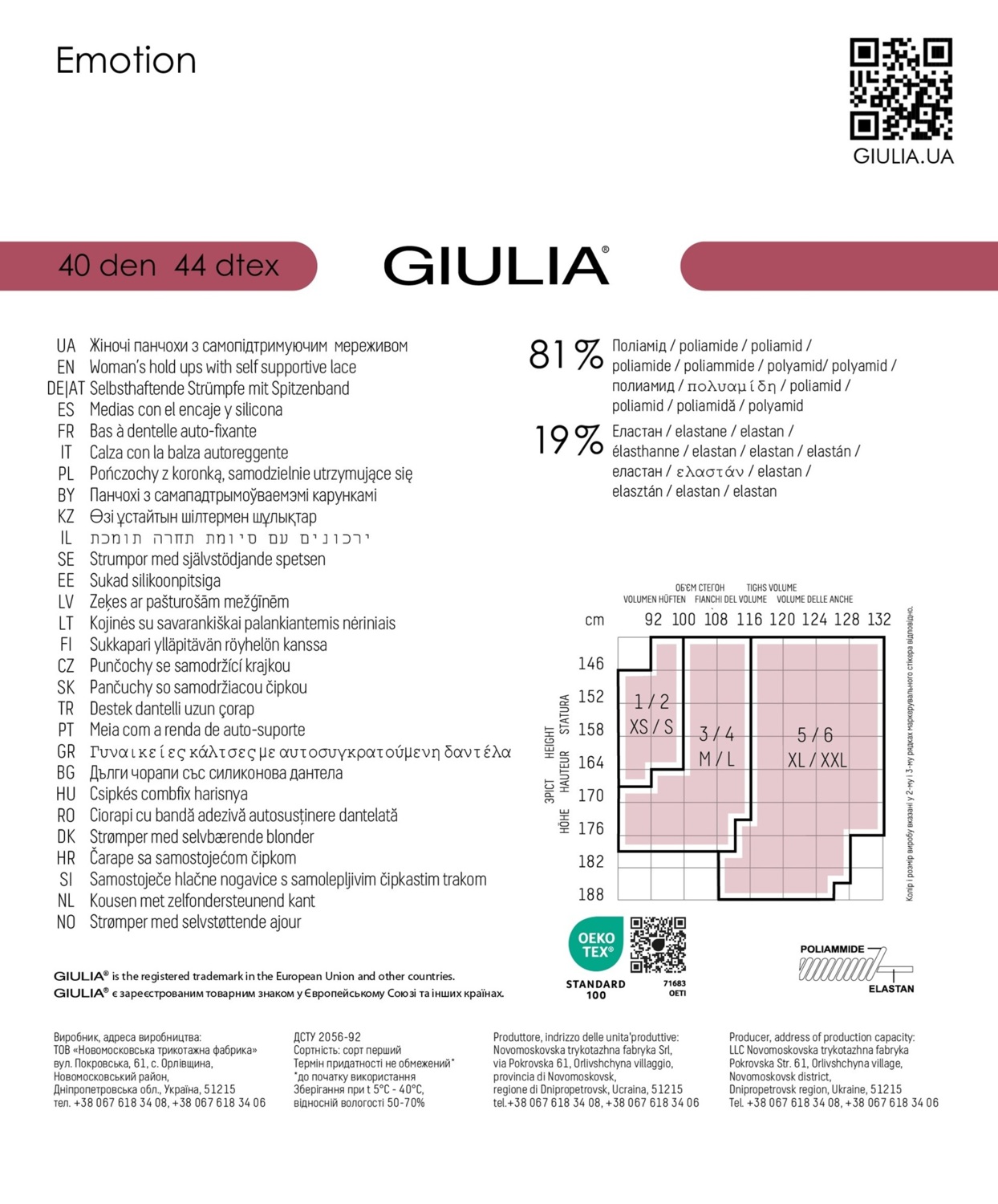 Роскошные чулки Giulia Emotion представляют собой изящное и функциональное изделие, которое декорировано ажурной резинкой шириной 8-9 см. С помощью силиконовой основы они фиксируются на бедрах и не требуют наличия пояса. Структура модели выполнена из полуматовой, эластичной микрофибры, плотностью 40 den, поэтому прекрасно облегают ножки.
