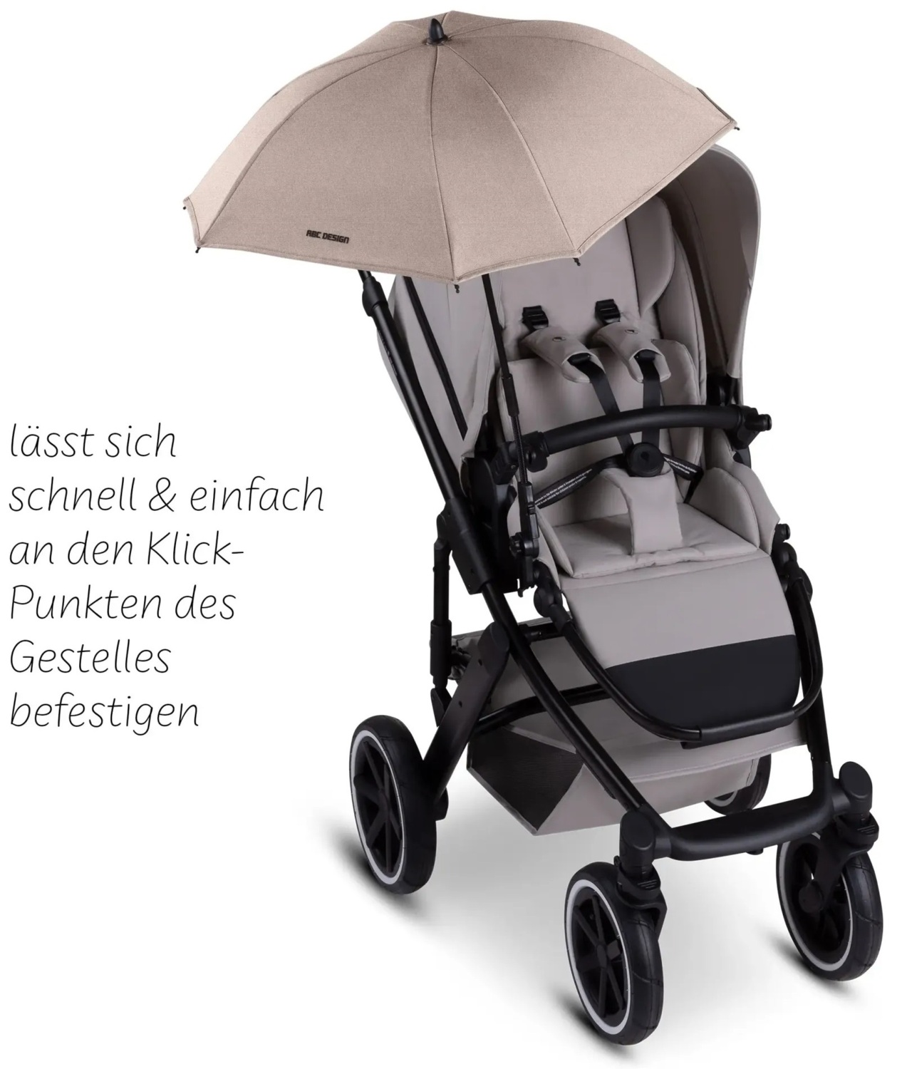 • Имеет два варианта крепления: используете ABC Design Universal Fix на ручке или защитном бампере, или универсальную клипсу на самой Sunny. Это позволяет надежно и гибко закрепить зонт.