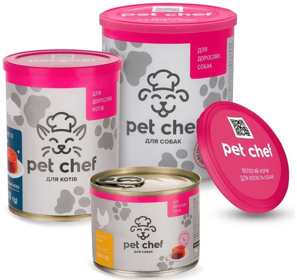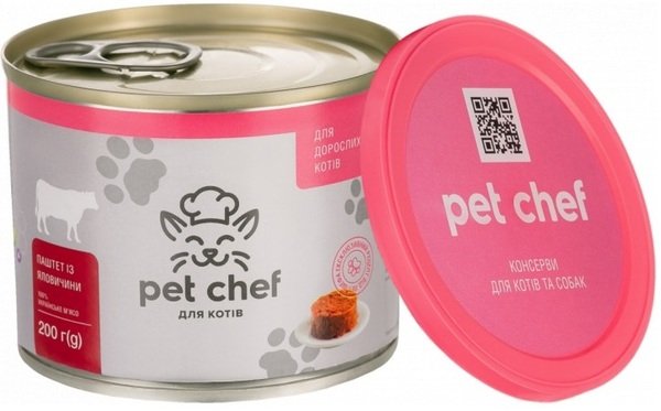 Pet Chef – эксклюзивный аппетитный сытный продукт для кошек по новой рецептуре в удобных банках, защищенных крышкой. Консервы Pet Chef производятся из украинского мяса и субпродуктов.