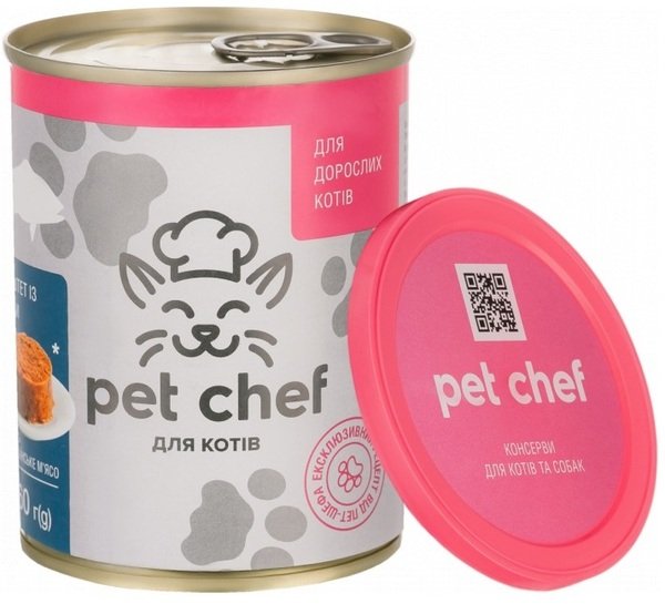 Pet Chef – эксклюзивный аппетитный сытный продукт для кошек по новой рецептуре в удобных банках, защищенных крышкой. Консервы Pet Chef производятся из украинского мяса и субпродуктов.