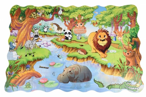 На днях взяла ребенку этот пазл, по его же желанию. Сейчас довольна и я, и ребенок. Шел пазл в красивой, хорошо запакованной коробке с рисунками зверей, с удобной ручкой. Всего пазлов 50 штучек. В комплекте так же идут яркие восковые карандаши, чтобы разукрашивать. Сложенная картинка получается яркой, там так же изображены животные. На обратной стороне пазла есть так же картинка, только черно-белая, её нужно разрисовать.