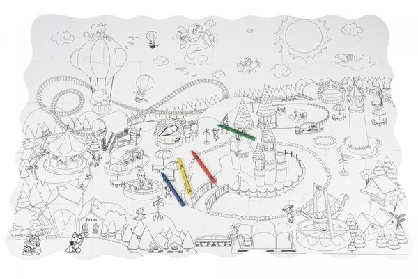 Необычный пазл «Парк развлечений» - игрушка 2 в 1: одновременно пазл и раскраска. Пазл состоит из 50 фрагментов с ярким изображением на лицевой стороне. На обороте - то же изображение, только черно-белое. Фрагменты пазла изготовлены из плотного картона, они не гнутся, а на ощупь гладкие. собрав пазл, ребенок может перевернуть его на «черно-белую» сторону и раскрасить. Для этого в наборе 4 цветные восковые карандаши. Собранная картинка размером 82х54 см. Собирая пазл, дети будут развивать мелкую моторику, координацию и ловкость движений, а ища необходимое место для вкладыша, память и логическое мышление.