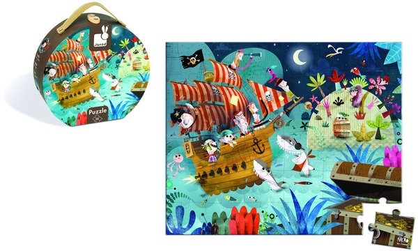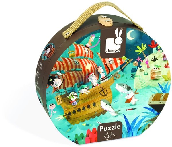 С помощью пазла Janod можно устроить настоящую охоту за сокровищами. Яркая картинка с оригинальным сюжетом, который активизирует фантазию и стимулирует мышление. Пазл состоит из 36 деталей; они картонные, плотные и очень качественные. Весь набор в стильном чемоданчике с ручкой. Внутри чемоданчика вы найдете детали для сборки картинки и собственно сам постер с изображением пазла. Детали пазла картонные; они покрыты безопасными красками на водной основе.