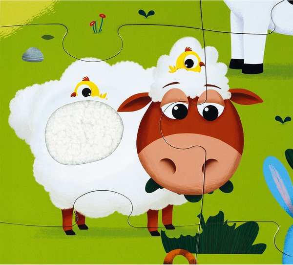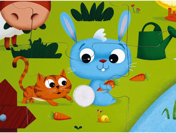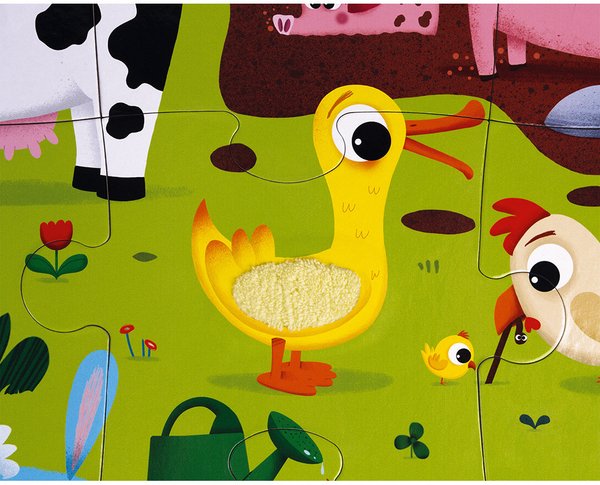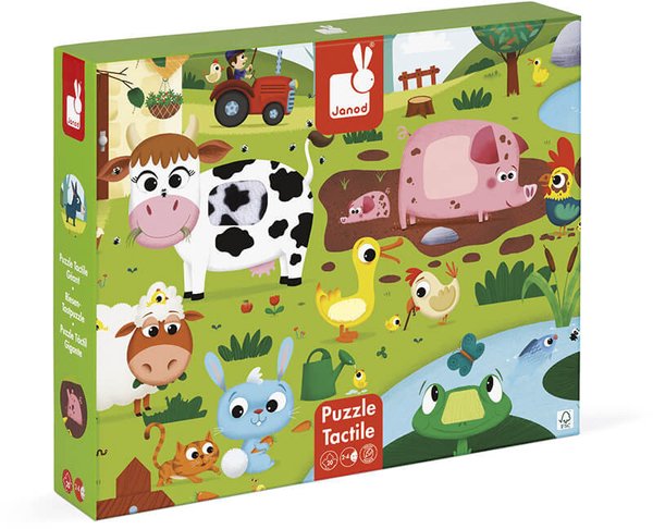 Тактильный пазл с изображением животных на ферме - оригинальная игрушка для детей от 3 лет. Особенность этого пазла в том, что отдельные части картинки имеют своеобразную текстуру. Просто прикоснитесь к изображениям и почувствуйте разницу. Изображение коровы, овцы, имитация хвоста кролика, поросенка, утка, петух и лягушка. Такая игрушка будет способствовать развитию мелкой моторики, тактильного восприятия у детей. Производитель - французский бренд Janod.