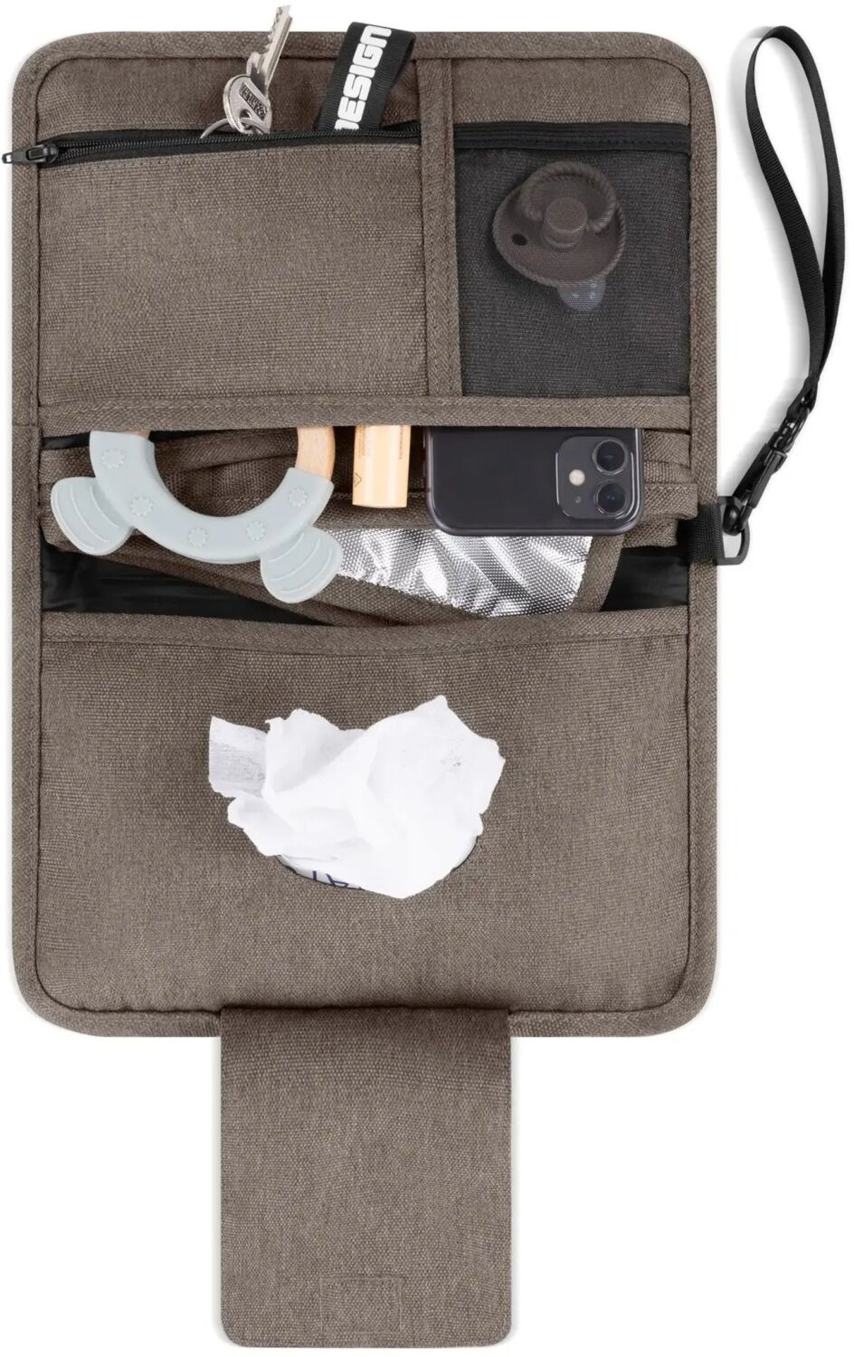 - Практичная магнитная застежка для основного кармана и отделения для влажных салфеток.
