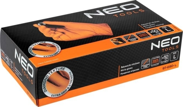 - Перчатки рабочие Neo Tools, перфорированные нитриловые, р.L, 50шт, оранжевые (97-690-L)