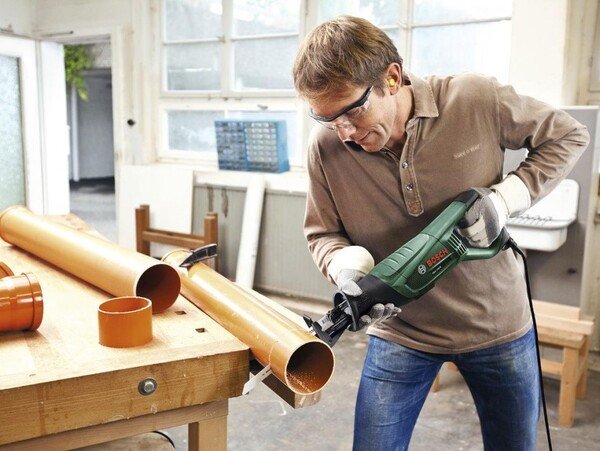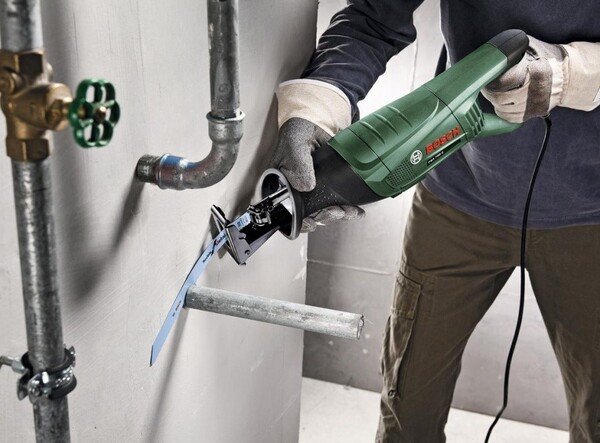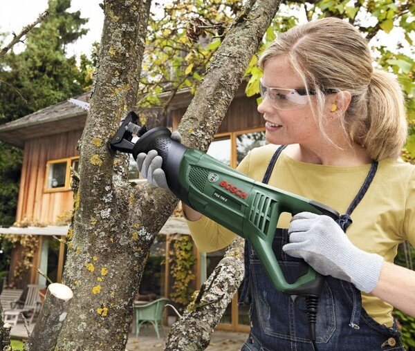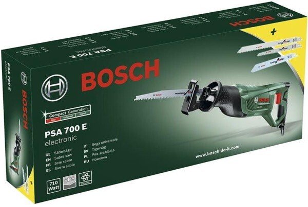 Мощная сабельная пила, которую так же называют электрической ножовкой, от ведущего мирового производителя электроинструмента. Этот инструмент предназначен для бытового или полупрофессионального применения. Отличительная особенность этой модели состоит в ее универсальности и достаточно высокой мощности. Сменные стандартные ножовочные полотна позволяют резать сухую и влажную древесину различных пород (толщиной до 150 мм), пластмассы и композиты (в том числе на основе стекловолокна), металл различной твердости (толщиной до 10 мм), гипсокартон, кирпич и пенобетон. Причем фирменные пильные полотна системы SDS с S-образным хвостовиком быстро заменяются без использования дополнительного инструмента. Высокая мощность двигателя пилы Bosch PSA 700 E в 710 Вт обеспечивает приличную скорость резания. Амплитуда движения или ход полотна равен 20 мм. Количество движений/ходов в минуту может достигать 2700 (на холостом ходу) и оно гибко регулируется силой нажатия пусковую кнопки. Устройство имеет эргономичный корпус, места удержания имеют анатомическую форму и обрезинены. Вес составляет 3,1 кг, что позволяет без проблем выполнять работы на вытянутых руках. Вибрация и уровень шума, создаваемые при активной работе, умеренны и находятся в допустимых границах.