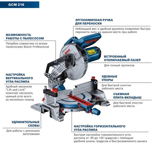 Торцовочная пила GCM 216 0601B33000 - универсальный инструмент предназначенный для продольного и поперечного пиления древесины и других материалов, при условии использования специализированных пильных дисков.