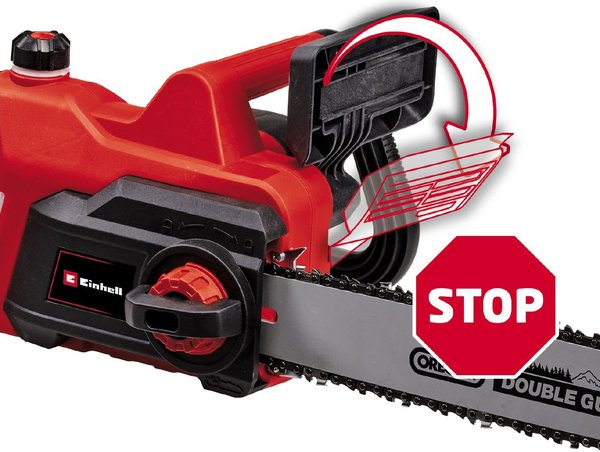 Безопасность обеспечивается защитой от отдачи в сочетании с мгновенным тормозом цепи, фиксатором цепи и защитным кожухом для рук.