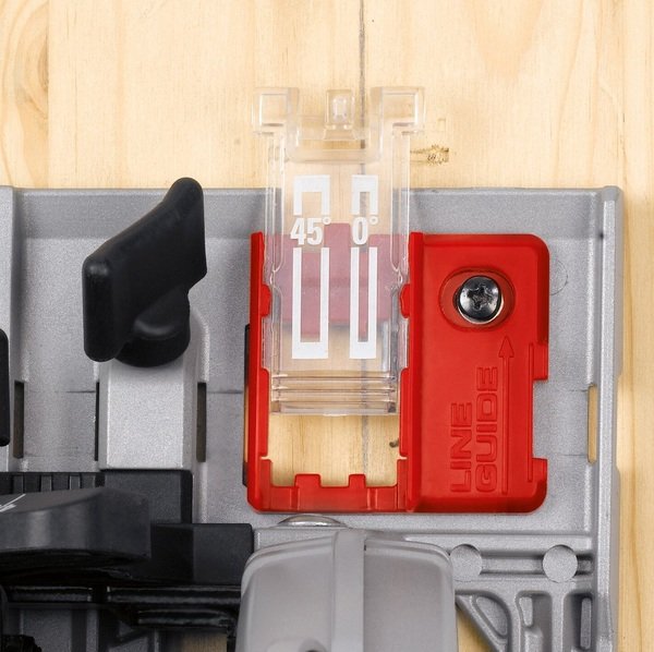 Точность распила также обеспечивают указательный маркер, который указывает на линию разреза в 0 и 45 градусов и ширину пропила, а также светодиодная подсветка рабочей зоны.