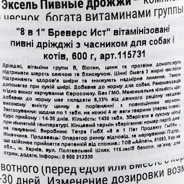 Витамины для собак и котов 8in1 Excel Brewers Yeast пивные дрожжи с чесноком для кожи и шерсти 260 штВитамины для собак и котов 8in1 Excel Brewers Yeast пивные дрожжи с чесноком для кожи и шерсти 260 шт