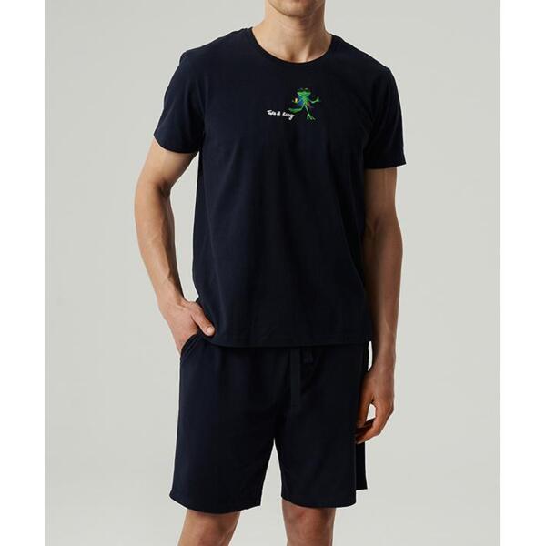 Футболка тёмно-синего цвета с коротким рукавом и круглым вырезом украшена велюровым принтом на груди в виде лягушки, придавая модели стильный и оригинальный акцент. Материал приятен к коже и сохраняет форму даже после многократных стирок.