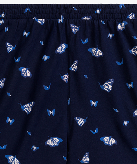 Шорты сшиты из 100% хлопка, тёмно-синего цвета, украшены небольшим принтом в виде бабочек. Модель имеет шнурок по талии для регулировки посадки и удобные боковые карманы, обеспечивая свободу движений и практичность.