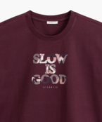 Кофта свободного кроя бордового цвета с аккуратным округлым вырезом украшена надписью на груди “slow is good”. Рукава и низ кофты отделаны мягкой резинкой, что создаёт удобную посадку и удерживает форму, не стесняя движений.