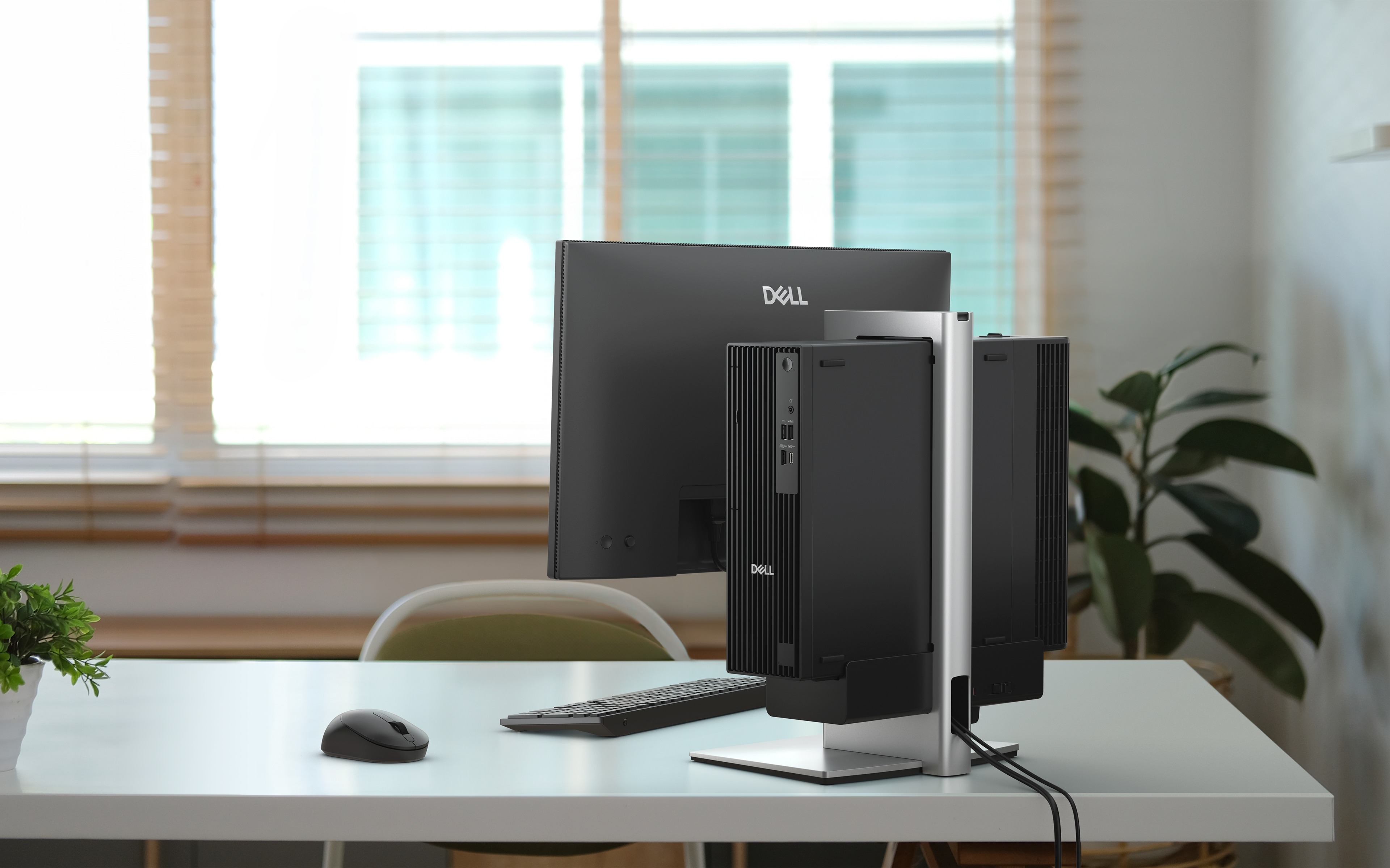 Установите его вертикально на столе или горизонтально для поддержки монитора и экономии ценного места на столе. Сохраняйте его в идеальном состоянии с помощью дополнительного пылевого фильтра для защиты компонентов и уменьшения количества кабелей с помощью дополнительной задней крышки Dell Pro Slim Cable Cover.