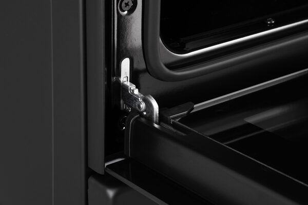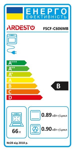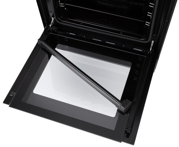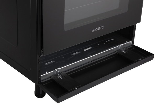 Духовой шкаф с подсветкой отличается довольно большим объемом - 66 литров. Класс энергоэффективности: В. Внутренняя камера покрыта эмалью, на боковых стенках имеются съемные направляющие, противень или проволочная решетка могут быть установлены на разных уровнях высоты. В конструкции также предусмотрены два нагревательных элемента: нижний чуть мощнее - 1 200 Вт, мощность верхнего - 1 000 Вт. Имеется режим конвекции (32 Вт). Дверца духовки оснащена двойным стеклом, в центре расположено прозрачное смотровое окошко для контроля процесса приготовления. Также имеется встроенный электрический таймер. Откидной ящик под духовкой предназначен для хранения сковородок или форм для выпечки.