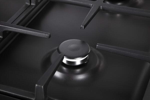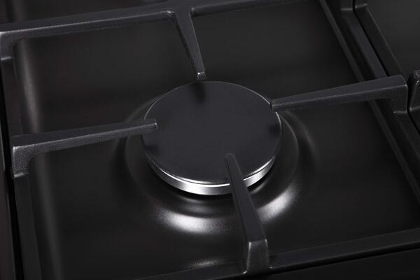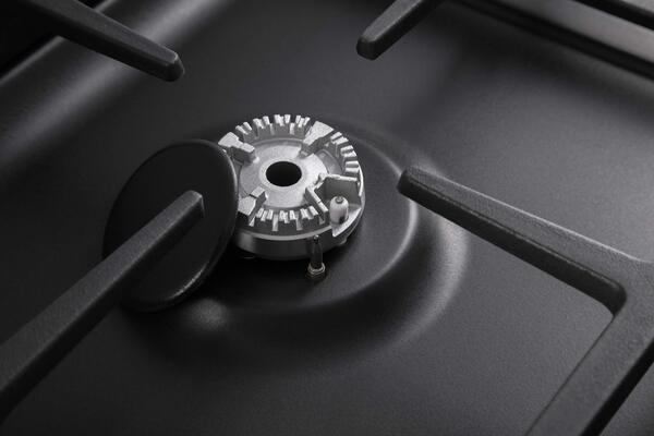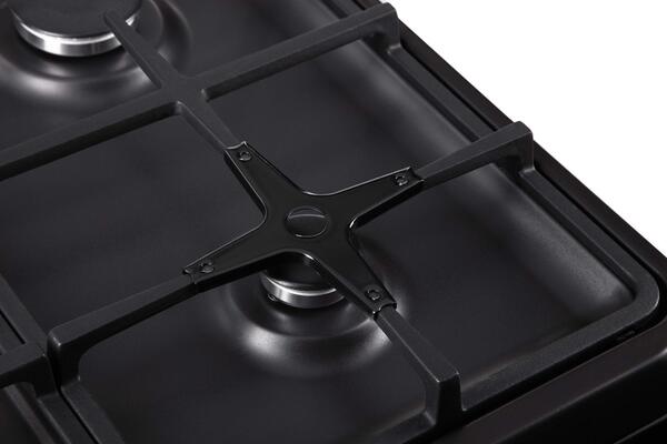 Общий расход газа составляет 0,629 м³/ч. Варочная поверхность состоит из четырех газовых конфорок, которые можно закрыть стеклянной крышкой: мощность быстрой конфорки - 2,6 кВт, двух полубыстрых - по 1,55 кВт, вспомогательной - 0,9 кВт. Две чугунные проволочные стойки эргономично расположены между конфорками. Поворотные колеса для регулировки интенсивности горения встроены в переднюю панель плиты, они являются своеобразным акцентом в общем дизайне, так как выполнены из нержавеющей стали, поэтому отличаются от черного матового цвета поверхности модели. В конструкции предусмотрены форсунки NG (G20 - 13 мбар) для подключения плиты к системе газоснабжения, также имеется функция газ-контроля, обеспечивающая безопасное использование прибора.