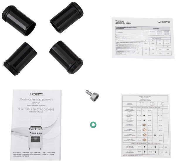 В комплект поставки комбинированной плиты входят все необходимые принадлежности, включая стандартный противень для выпечки и проволочную решетку. Кроме того, производитель дополнительно предоставляет насадки для подключения баллона со сжиженным газом (LPG). При использовании данного вида топлива рекомендуется подключать плиту к композитным баллонам Hexagon Ragasco, которые являются полностью взрывобезопасными, даже во время пожара риск взрыва исключен! Модель имеет стандартные размеры (ширина - 59,7 см, глубина - 61,9 см), поэтому хорошо подойдет к готовому кухонному гарнитуру