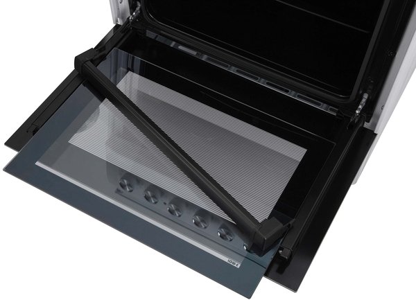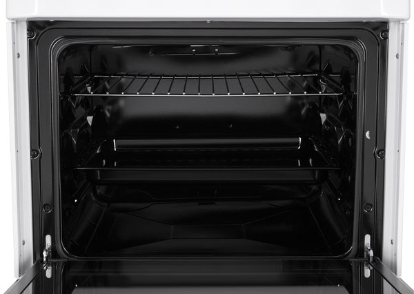 Для приготовления выпечки и других блюд плита оснащена духовым шкафом объемом 53 л. Изнутри камера покрыта эмалью легкой очистки, на боковых стенках - рельефные направляющие для установки противня или решетки. Духовой шкаф имеет два нагревательных элемента: мощность нижнего составляет 1 100 Вт, а верхнего - 1 200 Вт. Для удобства предусмотрено освещение внутренней камеры (25 Вт). Черная дверца имеет двойное стекло затемненное вдоль краев, тогда как в центре есть прозрачное смотровое окошко. На верхней части встроена белая эргономичная рукоятка. Для кухонных принадлежностей под духовым шкафом есть откидной ящик, поэтому не нужно искать специальное место на кухне для их хранения.