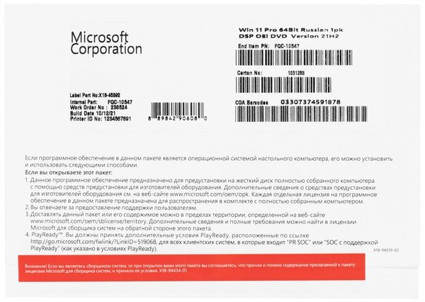 Операционная система Microsoft Windows 11 Pro 64Bit 1pk DSP OEI DVD (FQC-10547)