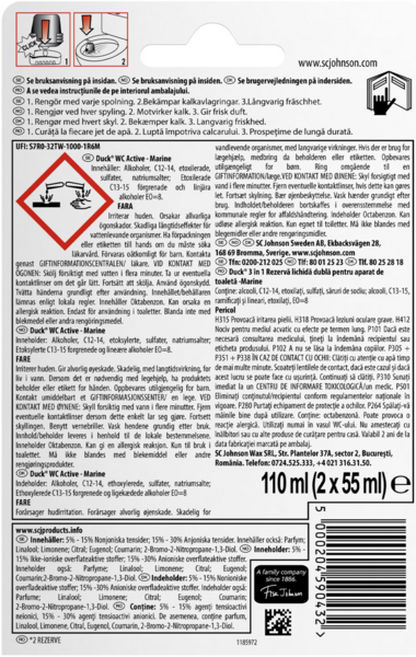 | Состав | Вода, а-ПАВ более 15% но менее 30%, растворитель, отдушка (линалоол, d-лимонен, цитраль, цитронеллол), н-ПАВ более 5% но менее 15%, фосфонаты менее 5%, загуститель, акриловый сополимер менее 5%, октабензон менее 5%, гидроксид натрия, консервант, красители |