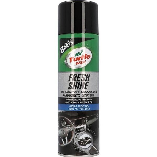 Полироль панели приборов с запахом ""Новый автомобиль"" Turtle Wax FRESH SHINE NEW CAR придает первоначальное состояние (ревитализирует) пластиковые, виниловые и резиновые элементы салона и панели приборов автомобиля, одновременно защищая их от выцветания, пересыхания и трещин. Содержит ароматические соединения, которые насыщают поверхности ароматом нового салона, который держится до 8 дней. Имеет уникальные двойные свойства, по применению - если после обработки поверхность протереть влажной тканью, поверхность будет иметь насыщенную матовую фактуру, если сухой - поверхность приобретает глянцевый эффект. Кроме того, средство содержит химические соединения, которые придают поверхности антистатические свойства, значительно уменьшают прилипание пыли и грязи, следовательно элементы салона дольше остаются чистыми.