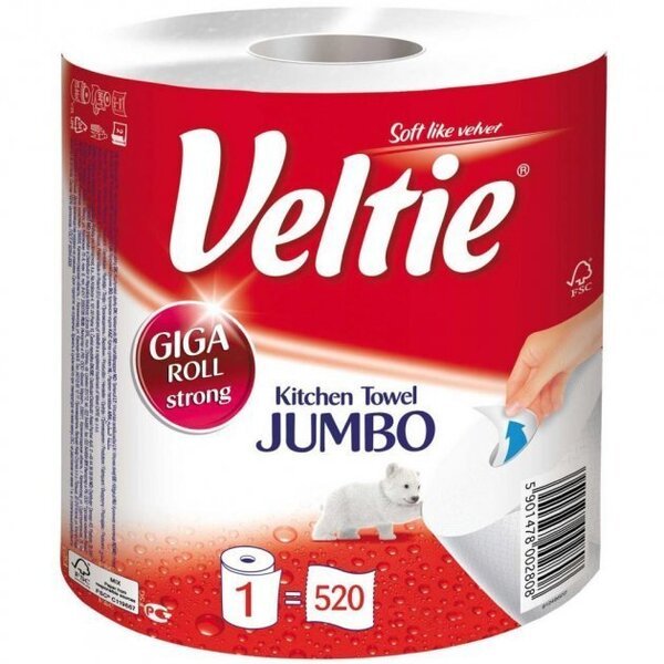 Бумажные полотенца VELTIE Jumbo с отличными впитывающими свойствами, станут незаменимы помо во время готовки или уборки. Подходят для просушки овощей и фруктов, чистки стекол, уборки и рассчитаны на 520 отрывов.