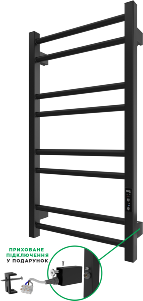Полотенцесушитель оборудован встроенным таймер-регулятором и коннектором для подключения к питанию с любой стороны. Температурные режимы таймер-регулятора: 40°C, 45°C, 50°C. Время работы: 3, 6 часов или постоянный нагрев.