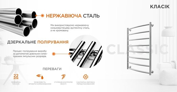Для изготовления полотенцесушителя используется нержавеющая низкоуглеродистая аустенитная сталь, что обеспечивает длительный срок службы и комфорт использования.