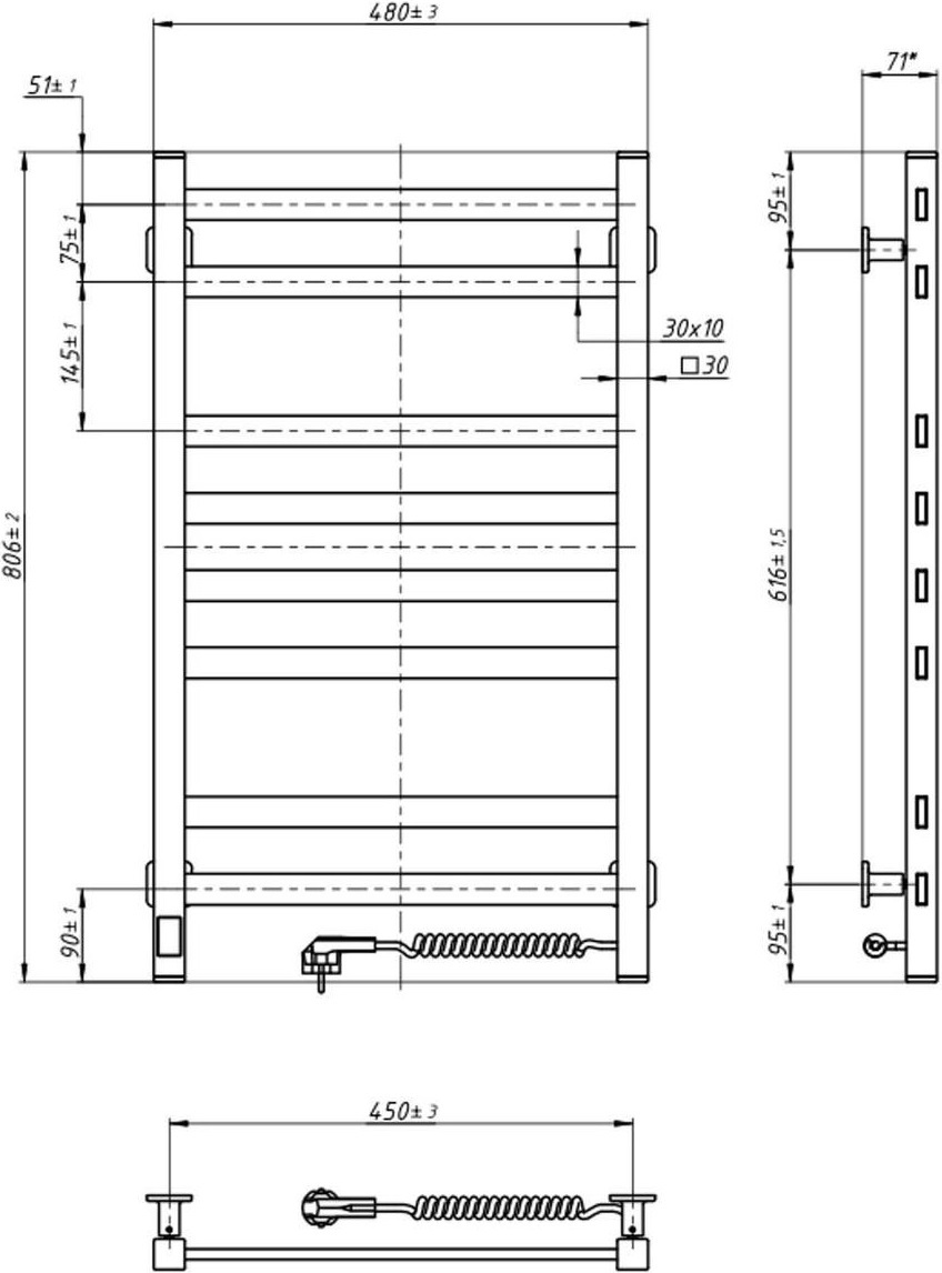 Электрический полотенцесушитель Navin Авангард — яркий образец минимализма. Модель имеет боковые коллекторы (стойки), выполненные из профильной квадратной трубы 30х30 мм, а перемычки — из прямоугольных трубок 30х10 мм. Это создает простую, строгую и привлекательную геометрическую гармонию. Продуманное расположение и оптимальные размеры элементов придают полотенцесушителям Авангард лаконичность, монументальность и однозначность формы.