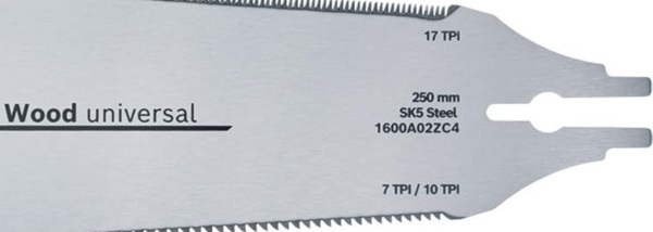 Полотно оснащено ультраострыми твердосплавными зубцами с обеих сторон, что делает его универсальным для различных видов резки. Зубцы с шагом 7-10 TPI (зубьев на дюйм) обеспечивают эффективное и быстрое продольное распиливание древесины. Мелкие зубцы предназначены для поперечной и диагональной резки. Зубцы с шагом 17 TPI и тройной заточкой обеспечивают точный и аккуратный поперечный и диагональный распил. Длина резки 250 мм позволяет работать с большими деталями и обеспечивает большую производительность.