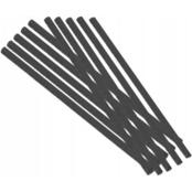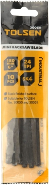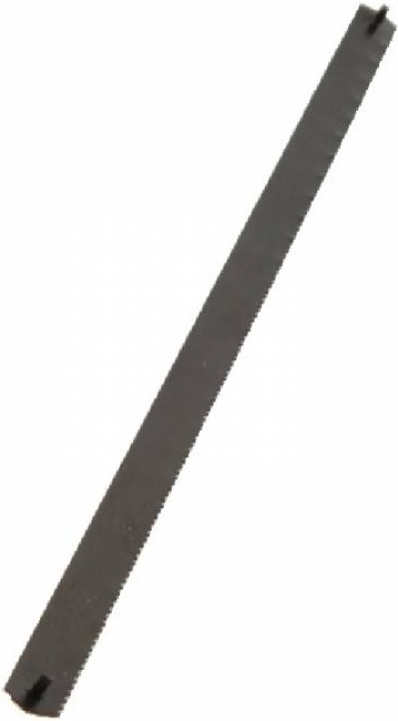 В комплект входят 10 запасных режущих полотен длиной 150 мм, предназначенных для мининожовки. С помощью этих сменных элементов можно выполнить распил цветных и нетвердых металлов, пластика. Полотно 24 TPI представляет собой узкую металлическую полоску, на одном краю которой располагаются острые зубцы. На каждом торце предусмотрено по отверстию для фиксации изделия в мининожовке. Режущий инструмент изготовлен из инструментальной стали SK4. Материал обладает высокой прочностью и не нуждается в частой заточке. Мелкие зубцы позволяют выполнить точный и аккуратный пропил материала.