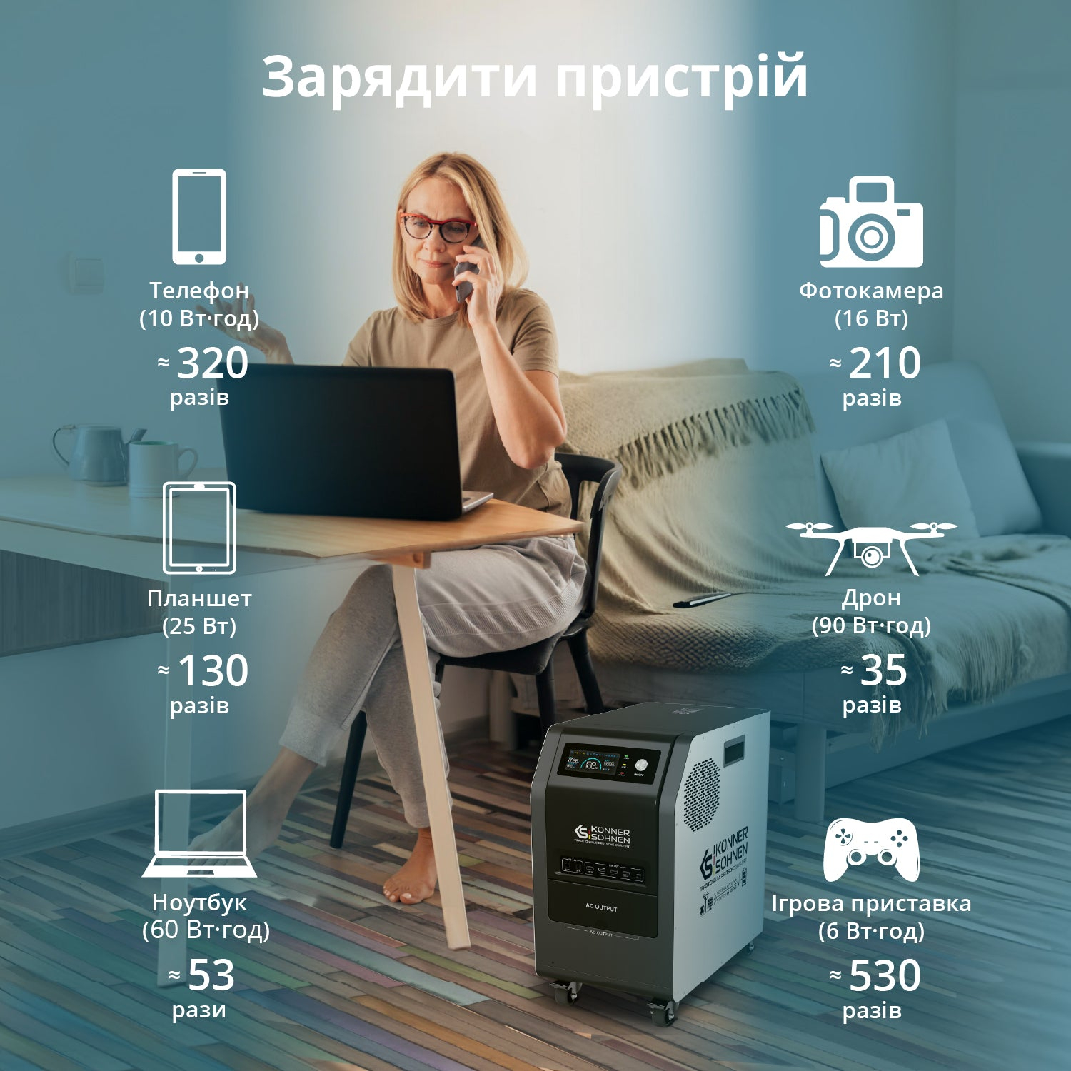 Электростанция обеспечивает бесперебойное питание подключенных устройств даже во время отключений электроэнергии или колебаний напряжения в сети. Станция переключает на себя питание в течение миллисекунд, защищая от потери данных, повреждения устройств и перерывов в работе.