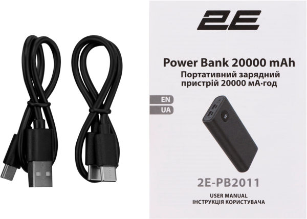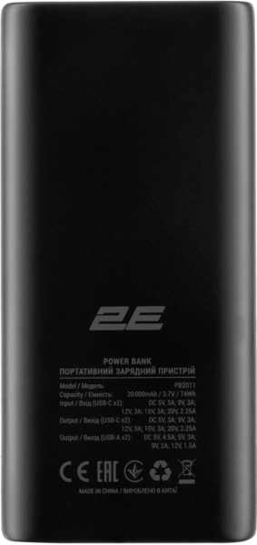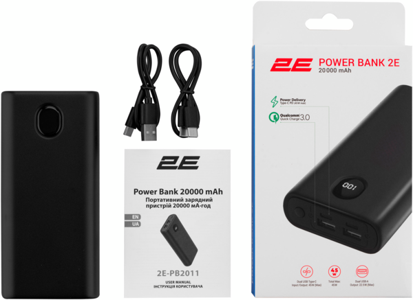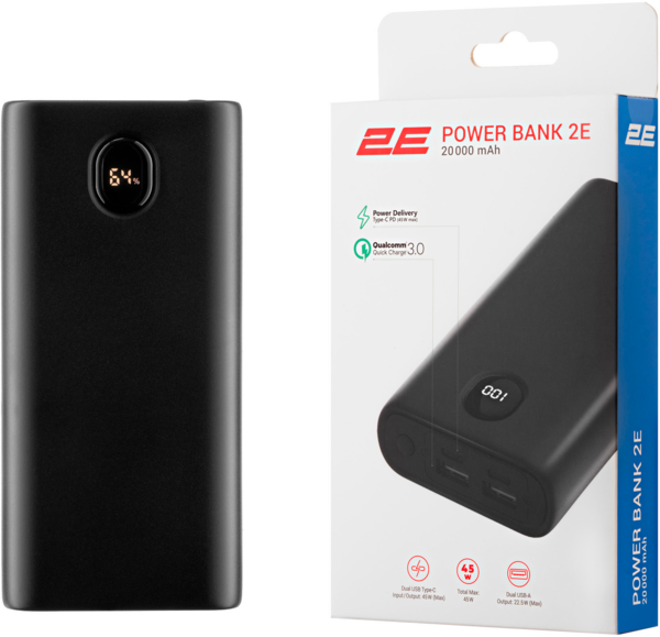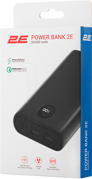 - Портативный аккумулятор литий-ионный Power Bank 2E 20000мАч, 45Вт, PD, QC, Black