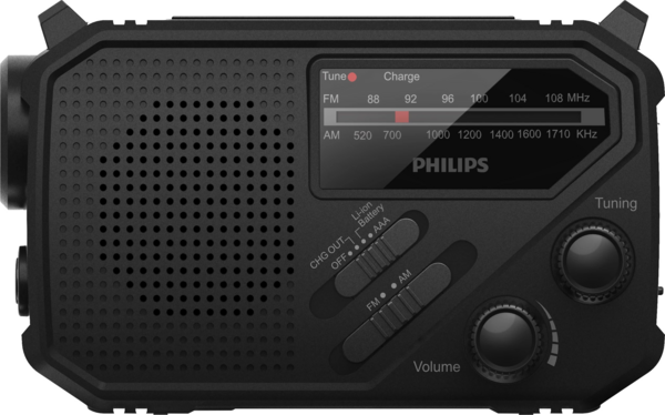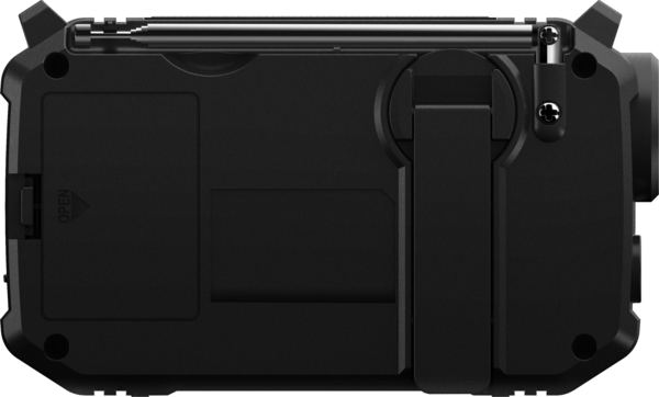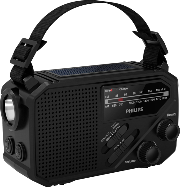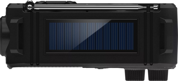 Никогда не теряйте заряд! Резервная зарядка всегда доступна через солнечные панели в верхней части радиоприемника или с помощью ручной рукоятки. Радиоприемник также работает от 3 батареек ААА (не входят в комплект). Порт USB-A позволяет использовать радиоприемник для зарядки других устройств в экстренной ситуации.