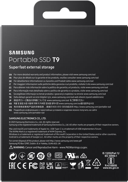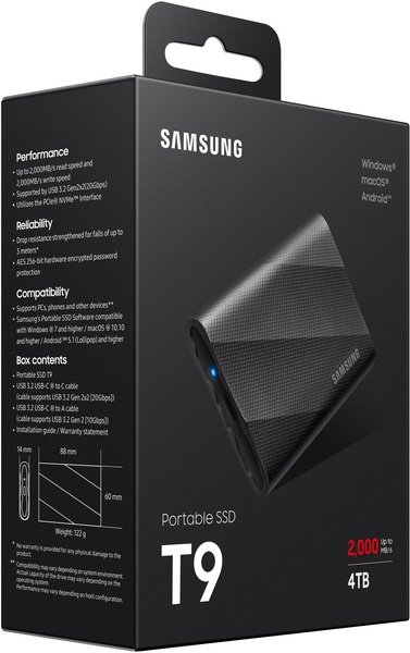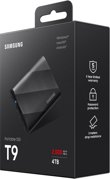 Благодаря технологии Dynamic Thermal Guard от Samsung, T9 сводит к минимуму потенциальное падение производительности из-за перегрева и поддерживает высокую скорость передачи данных. Кроме того, T9 разработан в соответствии с международным стандартом безопасности IEC 62368-1, что обеспечивает дополнительный уровень надежности и безопасности.