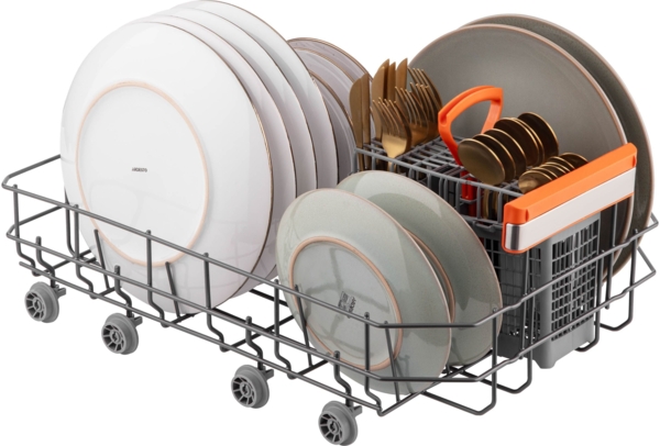 Посудомойка велика, вміщується багато тарілок і не тільки, є окремий відсік для столових приборів. Із того що мили на зараз проблем не було, весь бруд прибирало. Для кастрюль тільки не дуже зручно, саме розташування поличок, або ми ще не зрозуміли як краще використовувати. При повному завантаженні посуд висушується і майже без вологи