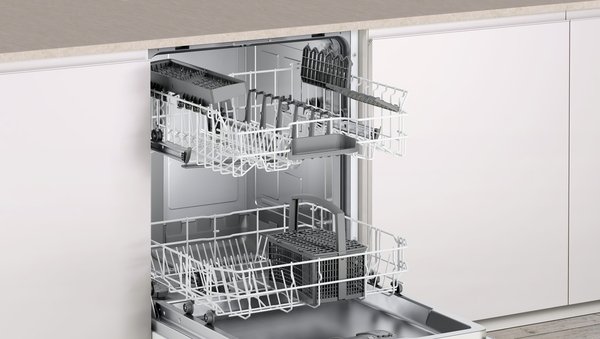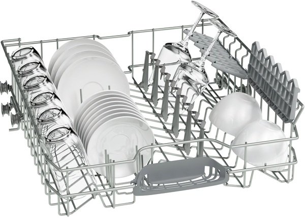 Модель шириной 600 мм идеально подойдет к стандартным габаритам кухонного гарнитура. Полный размер определяет одновременную загрузку посуды после обеда стандартной семьи из четырех человек. Если посуды меньше, возможно установить режим половинной загрузки. Камера машины оборудована дополнительной корзиной для столовых приборов и двумя выдвижными полками. Покупая посудомойку Бош, можно больше не вспоминать о трудностях мытья посуды. Сияние столовых приборов, экономия сил и денег — результат этой покупки