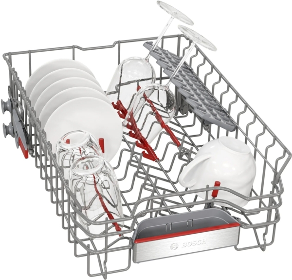 Вместительный верхний короб можно регулировать по высоте в целом на 5 см между тремя положениями простым движением руки - благодаря системе RackMatic. Тарелки для пиццы или фужеры на высокой ножке - эта система позволяет очень гибко создать дополнительное место для высоких предметов посуды в верхнем или нижнем коробе.