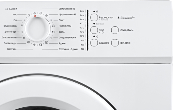 Программы для разных типов ткани и степени загрязнения: Хлопок, Микс, Синтетика, Деликатная стирка, Супербыстрая стирка за 15 минут, Полоскание и отжим, Отжим, и другие.