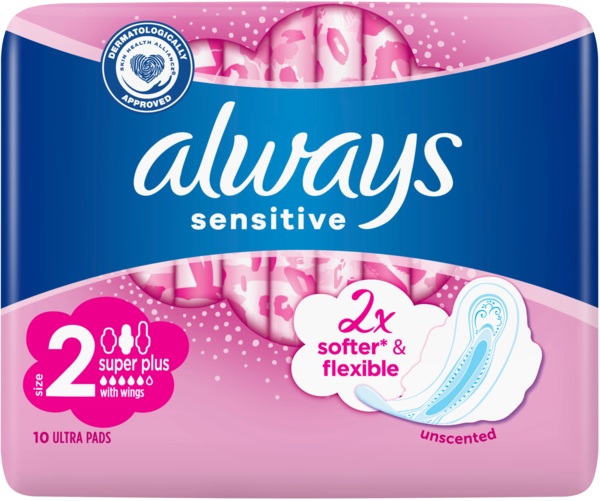 Мягкая хлопковая оболочка и уникальные зоны комфорта обеспечивают дополнительный комфорт для чувствительной кожи. Эти гигиенические прокладки идеально подходят для умеренных и сильных кровотечений во время менструального цикла. Крылышки обеспечивают дополнительную защиту и помогают удерживать прокладку на месте. Крылатые гигиенические прокладки Always Ultra Sensitive Super Plus (размер 2) - лучшие из продуктов Always Sensitive для использования при очень сильных кровотечениях.