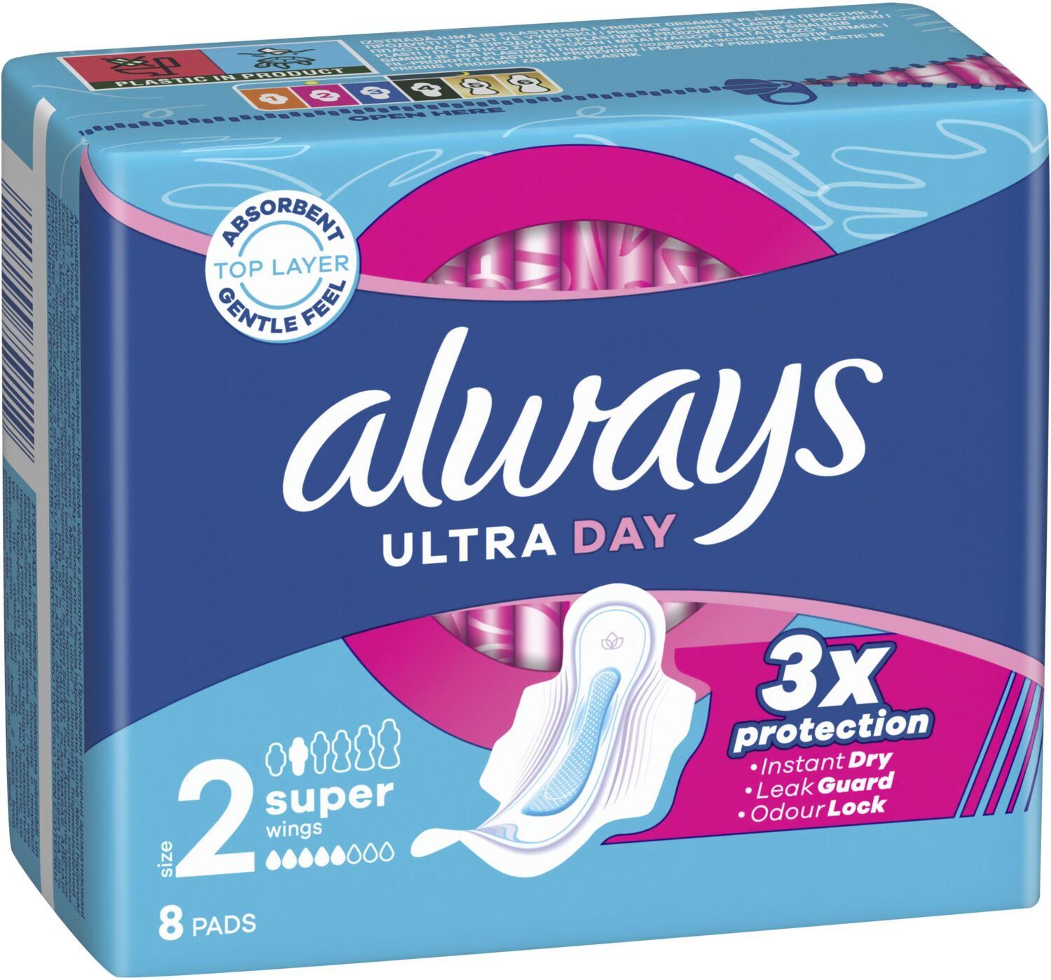 Гигиенические прокладки с крылышками Always Ultra Day Super (размер 2) обеспечивают тройную защиту, и вы не должны соглашаться на меньшее. Прокладки Always с мягким впитывающим верхним слоем поглощают влагу за считанные секунды благодаря технологии InstantDry, а с технологиями LeakGuard и OdourLock они также предотвращают протекание и возникновение неприятных запахов. Уникальные крылышки ComfortLock прокладок предназначены для лучшего прилегания к любому виду белья. Прокладки Always одобрены дерматологами Skin Health Alliance.