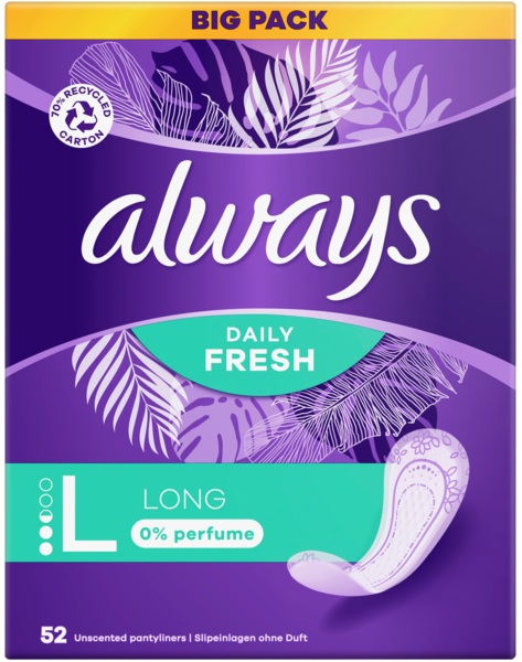 Наслаждайтесь свежестью в течение всего дня с удлиненными ежедневными прокладками Always Daily Fresh. Благодаря непревзойденному сочетанию комфорта и защиты вы можете полностью полагаться на эти прокладки каждый день, почти не ощущая их во время использования. Их удлиненная форма обеспечивает необходимую защиту, а материалы, пропускающие воздух, дарят ощущение чистоты и свежести кожи в течение всего дня. Идеально подходят для вагинальных выделений, как дополнительная защита во время нерегулярных и легких менструаций, а также других незначительных выделений. Эти ежедневные прокладки содержат 0% отдушек.