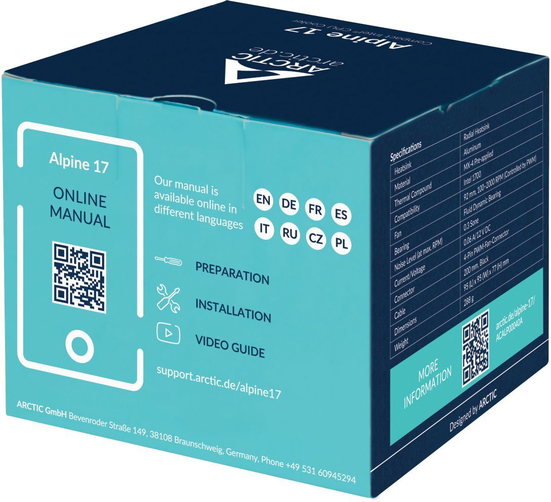 Благодаря предварительно нанесенной термопасте, Alpine 17 можно устанавливать напрямую. Благодаря штифтам установка не представляет никаких трудностей. Для монтажа кулера не требуются дополнительные инструменты.