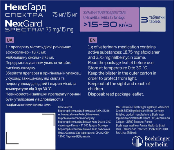 - Противопаразитарные таблетки для собак 15-30 кг Нексгард Спектра 3 таб