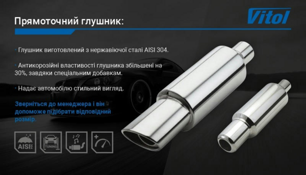 Прямоточный глушитель от торговой марки Vitol выполнен из нержавеющей стали и прекрасно противостоит коррозии даже при попадании на него антигололедных реагентов, которые используются в зимнее время года. Прямоточный глушитель ускоряет отвод отработанных газов, улучшает работу мотора, добавляя мощности вашему автомобилю благодаря уменьшению сопротивления выхлопных газов, а также, издавая басовитый звук выхлопа, заставляет окружающих задуматься, а что же у Вас под капотом? Кроме всего прочего, что не менее важно, это улучшение эстетического вида автомобиля.