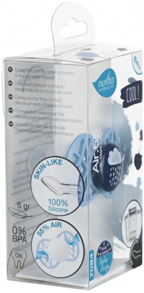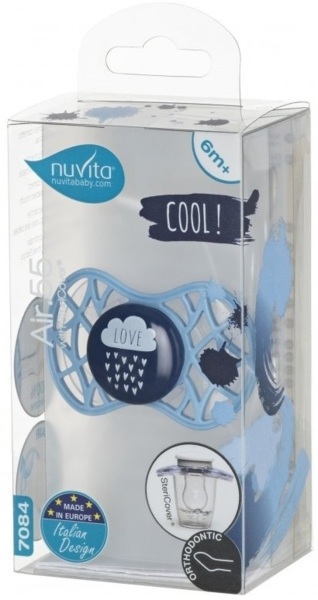 Пустышка ортодонтическая Nuvita Air55 Cool. Пластина соски на 55% состоит из воздуха обеспечивая почти полную аэрацию области вокруг рта, избегая скопления слюны, которая может раздражать кожу. Защитный колпачок для соски для поддержания чистоты соски и стерилизации в микроволновой печи простым добавлением воды.