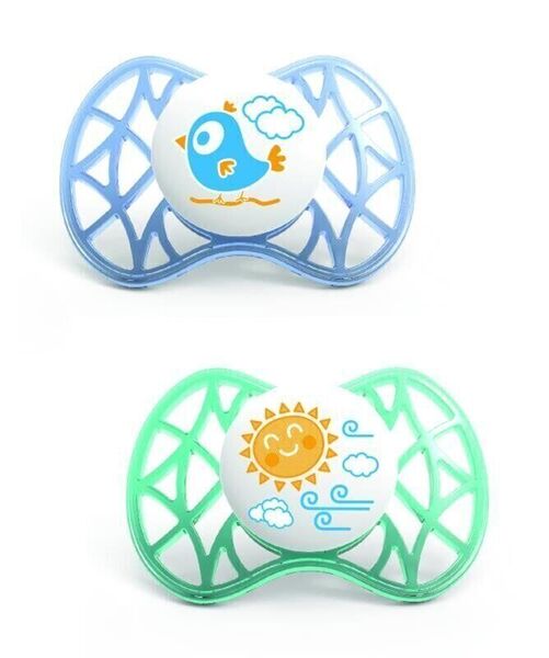 Симметричная пустышка Nuvita Air идеально подошла моему 6 месячному мальчику. Приобрела здесь по рекомендации педиатра. В наборе 2 штуки - одна с солнышком, другая с птичкой. Яркие, сынишке нравятся. Материалы очень качественные. Интересный дизайн корпуса. Изготовлен в виде сеточки, что обеспечивает дополнительную проходимость воздуха. Это помогает избежать скоплению слюны вокруг рта, потому покраснений на щеках не возникает. Сосок имеет инновационную анатомическую форму, что способствует правильному развитию неба. В комплекте идет защитный колпачок, благодаря которому сохраняется чистота соски. Можно стерилизовать - под действием высоких температур не теряет форму.