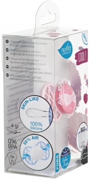Пустышка симметрическая Nuvita NV7065 Air55 Cool 0m+ "BE HAPPY" цвет "розовый кварц". Пластинка соски на 55% состоит из воздуха обеспечивая почти полную аэрацию области вокруг рта, избегая скопления слюны, которая может раздражать кожу. Защитный колпачок для соски для поддержания чистоты соски и стерилизации в микроволновой печи простым добавлением воды.