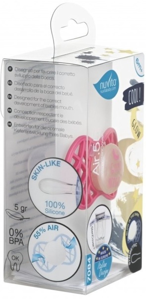 Симметрическая пустышка Air55 Cool, которая светится в темноте. Пластинка соски на 55% состоит из воздуха обеспечивая почти полную аэрацию области вокруг рта, избегая скопления слюны, которая может раздражать кожу. Защитный колпачок для соски для поддержания чистоты соски и стерилизации в микроволновой печи простым добавлением воды.